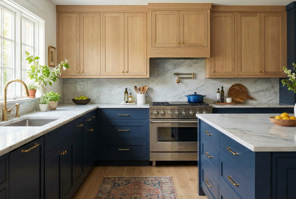 We often use plywood for cabinet boxes and MDF for door panels — a combination that gives you strength, beauty, and longevity.